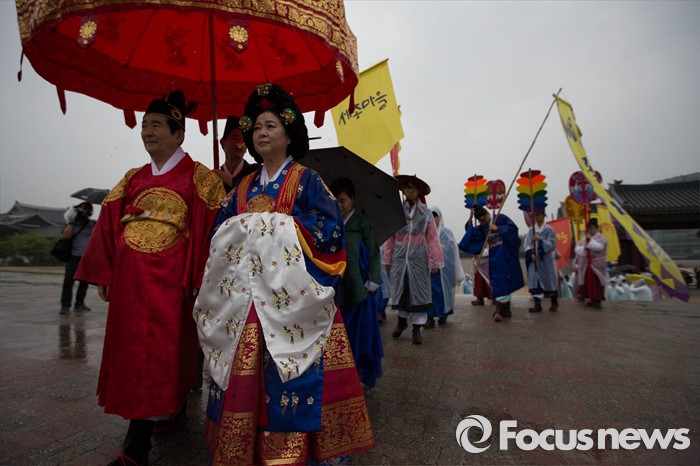 (서울=포커스뉴스) 세종대왕 탄신 619주년인 15일 오후 서울 종로구 통인시장 일대에서 세종대왕 어가행렬이 재현되고 있다.