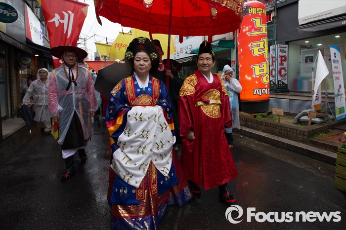 (서울=포커스뉴스) 세종대왕 탄신 619주년인 15일 오후 서울 종로구 통인시장 일대에서 세종대왕 어가행렬이 재현되고 있다.