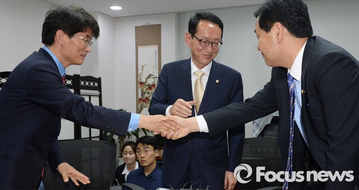 | △ 인사하는 3당 원내수석 |