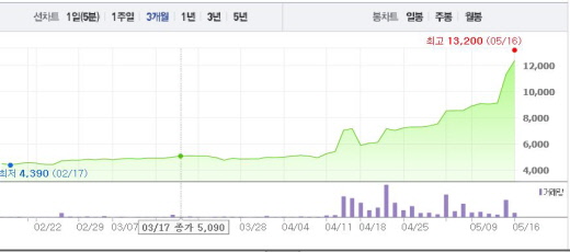 보성파워텍은 16일 오전 9시18분 현재 전일 대비 9.25%(1050원) 상승한 1만2450원에 거래되고 있다. 이는 2달 전 주가인 3월14일(3930원)과 비교했을 때 3.16배 상승한 수치다.