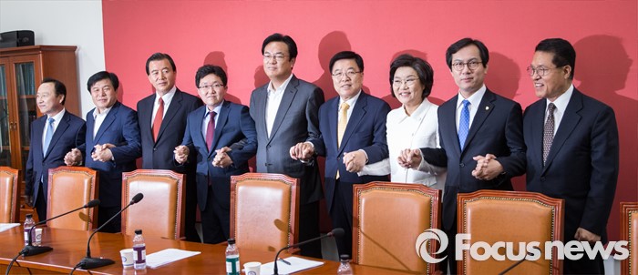 (서울=포커스뉴스) 정진석 새누리당 원내대표와 김광림 정책위의장, 김용태 혁신위원장을 비롯한 비대위원들이16일 오전 서울 여의도 국회에서 상견례를 갖고 취재진을 향해 포즈를 취하고 있다. 왼쪽부터 홍일표, 이진복, 비대위원, 홍문표 사무총장 대행, 김용태 혁신위원장, 정진석 원내대표, 김광림 정책위의장, 이혜훈, 김영우, 정운천 비대위원.