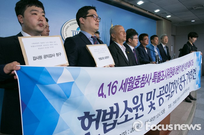 (서울=포커스뉴스) 16일 오전 서울 여의도 국회 정론관에서 민주사회를 위한 변호사모임 등 관계자들이 4·16 세월호참사 특별조사위원회 하반기 예산 미편성 위법에 따른 헌법소원 및 공익감사 청구 기자회견을 하고 있다.
