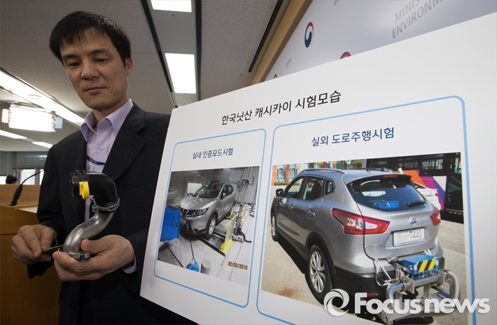 (세종=포커스뉴스) 홍동곤 환경부 교통환경과장이 16일 오전 세종시 정부세종청사 환경부 기자실에서 브리핑을 열고 지난해 12월부터 지난 4월까지 150일 동안 국내에서 판매된 경유자동차 20종을 조사한 결과 한국닛산 캐시카이 차량의 배기가스를 불법 조작하는 임의설정 한 것으로 판단된다고 밝히고 있다. 환경부는 한국닛산에 3억3000만원의 과징금 부과와 함께 판매정지 및 리콜(814대) 명령을 내릴 계획이다.