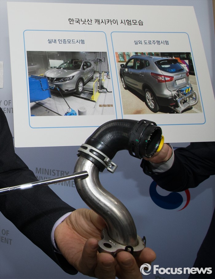 (세종=포커스뉴스) 홍동곤 환경부 교통환경과장이 16일 오전 세종시 정부세종청사 환경부 기자실에서 브리핑을 열고 지난해 12월부터 지난 4월까지 150일 동안 국내에서 판매된 경유자동차 20종을 조사한 결과 한국닛산 캐시카이 차량의 배기가스를 불법 조작하는 임의설정 한 것으로 판단된다고 밝히고 있다. 환경부는 한국닛산에 3억3000만원의 과징금 부과와 함께 판매정지 및 리콜(814대) 명령을 내릴 계획이다.