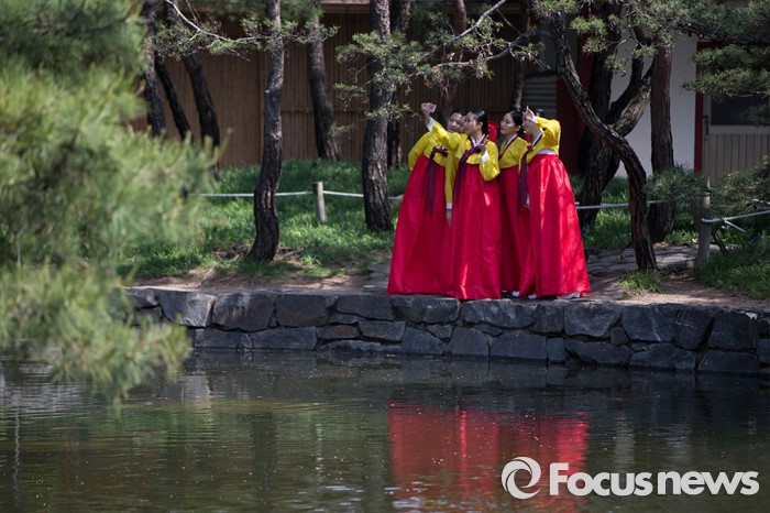 (서울=포커스뉴스) 16일 오전 서울 중구 남산골 한옥마을 천우각 광장에서 열린 제44회 성년의 날 행사에 참석한 학생들이 행사에 앞서 사진을 찍고 있다.