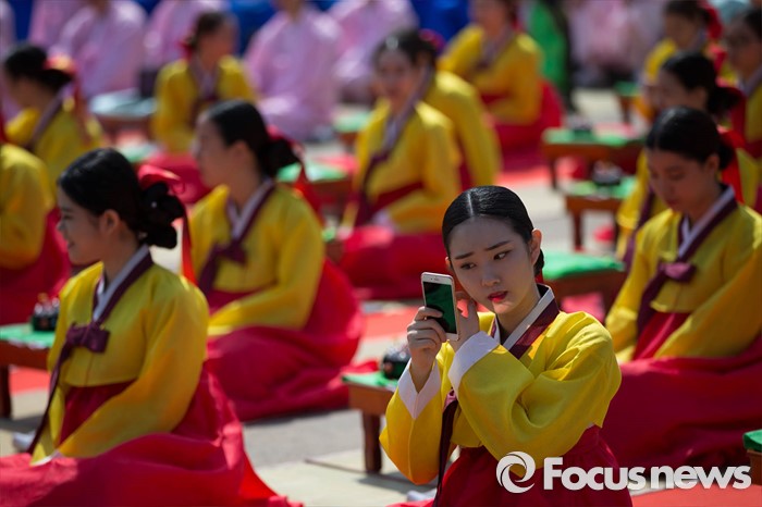 (서울=포커스뉴스) 16일 오전 서울 중구 남산골 한옥마을 천우각 광장에서 열린 제44회 성년의 날 행사에 참석한 학생들이 전통 성년례를 올리고 있다.