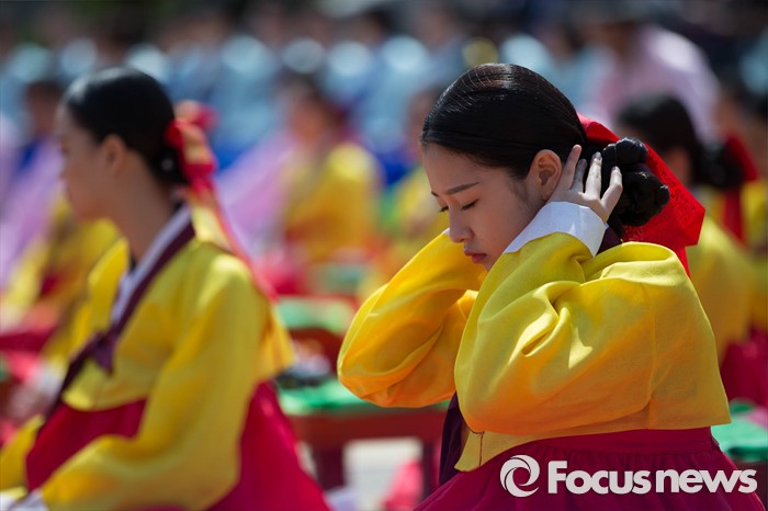 (서울=포커스뉴스) 16일 오전 서울 중구 남산골 한옥마을 천우각 광장에서 열린 제44회 성년의 날 행사에 참석한 학생들이 전통 성년례를 올리고 있다.