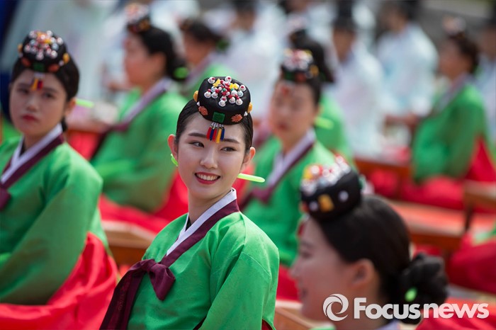 (서울=포커스뉴스) 16일 오전 서울 중구 남산골 한옥마을 천우각 광장에서 열린 제44회 성년의 날 행사에 참석한 학생들이 전통 성년례를 올리고 있다.