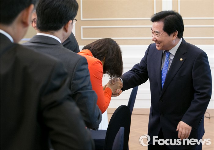 (서울=포커스뉴스) 이석현(오른쪽) 국회 부의장이 16일 오후 서울 여의도 국회 귀빈식당에서 열린 필리버스터 발언 의원 초청 오찬 간담회에 참석해 의원들과 인사하고 있다.