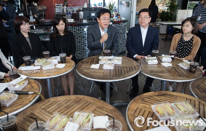 (서울=포커스뉴스) 정진석(오른쪽 세번째) 새누리당 원내대표와 김광림(오른쪽 두번째) 정책위의장이 16일 오후 서울 여의도 한강공원의 한 카페에서 여성 당직자들과 '3040여성당직자 브라운백 미팅'을 갖고 있다.