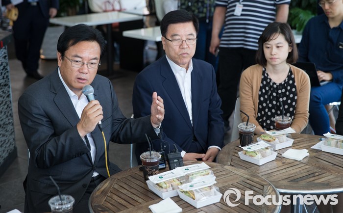 (서울=포커스뉴스) 정진석(왼쪽) 새누리당 원내대표와 김광림(왼쪽 두번째) 정책위의장이 16일 오후 서울 여의도 한강공원의 한 카페에서 '3040여성당직자 브라운백 미팅'을 갖고 있다.
