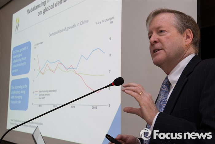 (세종=포커스뉴스) 랜달존스(Randal Jones) OECD 사무국 선임이코노미스트가 16일 오전 세종시 KDI(한국개발연구원) 영상회의실에서 열린 OECD 한국 경제보고서 발표 세미나에서 거시경제 동향 및 전망에 대한 기조발표를 하고 있다.