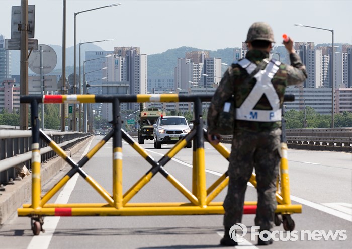 (서울=포커스뉴스) 제401차 민방위의 날인 16일 오후 서울 용산구 반포대교에서 군·경 관계자들이 합동 전시 교통통제소 설치 민방공대피훈련을 하고 있다.