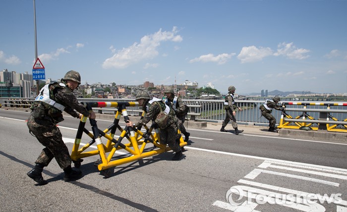 (서울=포커스뉴스) 제401차 민방위의 날인 16일 오후 서울 용산구 반포대교에서 군·경 관계자들이 합동 전시 교통통제소 설치 민방공대피훈련을 하고 있다.