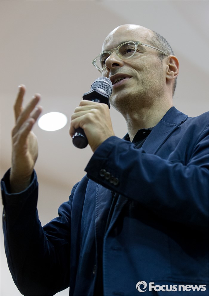 (서울=포커스뉴스) 16일 오후 서울 종로구 서울예술고등학교를 찾은 프랑스 작가 베르나르 베르베르가 '오늘날의 예술적 지능'이란 주제로 학생들에게 강연하고 있다.