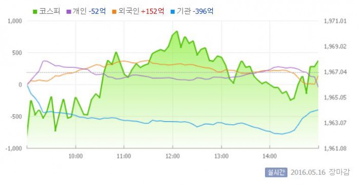 16일 코스피지수는 전거래일 대비 0.05%(0.92포인트) 오른 1967.91에 장을 마쳤다. 코스닥지수는 전거래일 보다 0.41%(2.91포인트) 내린 701.46에 마감했다.