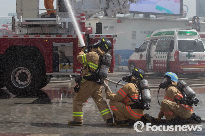 (서울=포커스뉴스) 16일 오후 서울 송파구 제2롯데월드몰에서 소방관들이 '재난대응 안전한국훈련'에 참가해 화재진압 훈련을 하고 있다.