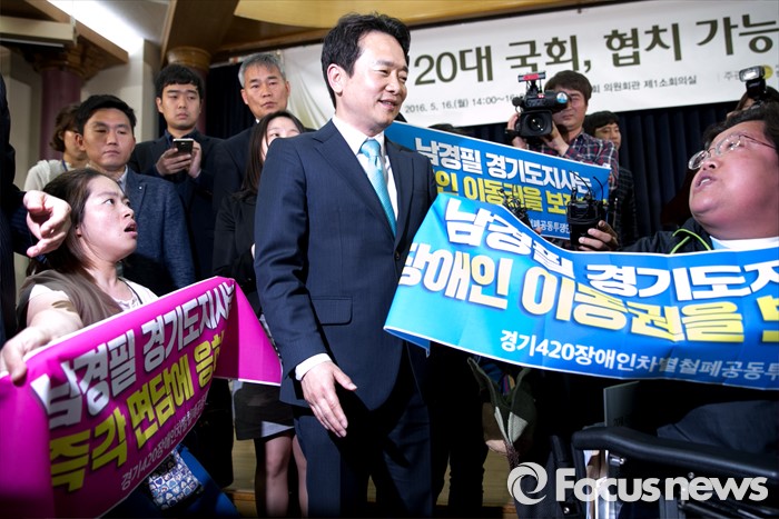 (서울=포커스뉴스) 16일 오후 서울 여의도 국회 의원회관에서 열린 '20대 국회, 협치 가능한가' 토론회에 참석한 남경필 경기도지사의 인사말 도중 장애인 이동권 보장을 요구하는 경기420장애인차별철폐공동투쟁단 등이 남 지사와 면담을 요구하며 손피켓을 들고 있다.
