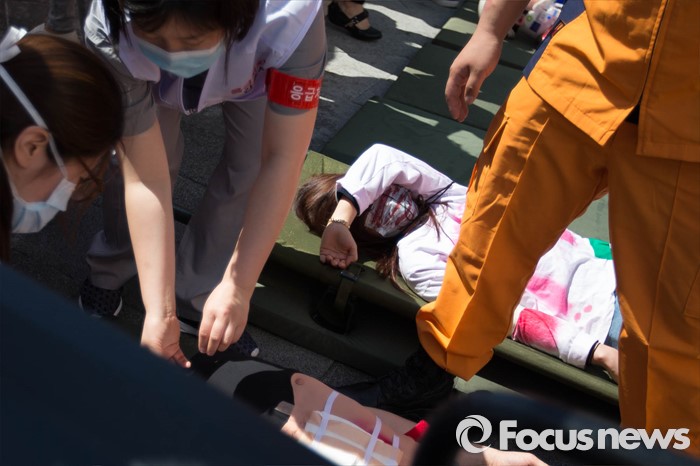 (서울=포커스뉴스) 16일 오후 서울 송파구 제2롯데월드몰에서 시민들이 '재난대응 안전한국훈련'에 참가하고 있다.