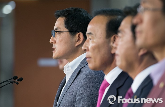 (서울=포커스뉴스) 16일 오후 서울 여의도 국회 정론관에서 새누리당 초·재선 의원 및 당선인들이 당 혁신위와 비대위원 재검토를 요구하는 성명서 발표 기자회견을 하고 있다. 오른쪽부터 함진규, 김태흠, 박덕흠, 박대출 의원.
