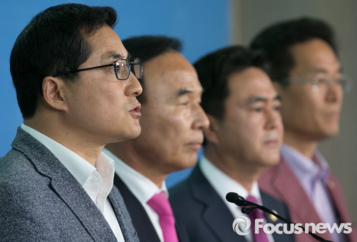 (서울=포커스뉴스) 16일 오후 서울 여의도 국회 정론관에서 새누리당 초·재선 의원 및 당선인들이 당 혁신위와 비대위원 재검토를 요구하는 성명서 발표 기자회견을 하고 있다. 오른쪽부터 함진규, 김태흠, 박덕흠, 박대출 의원.