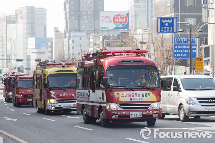 국민안전처는 개정안 통과 이후 보험관계기관들이 적극적으로 협조했다고 밝혔다.(서울=포커스뉴스) 올해 첫 민방위 훈련이 실시된 15일 오후 서울 마포대로 일대에서 마포소방서 소속 소방차가 길터주기 국민참여 훈련을 하고 있다. 2016.03.15 조종원 기자