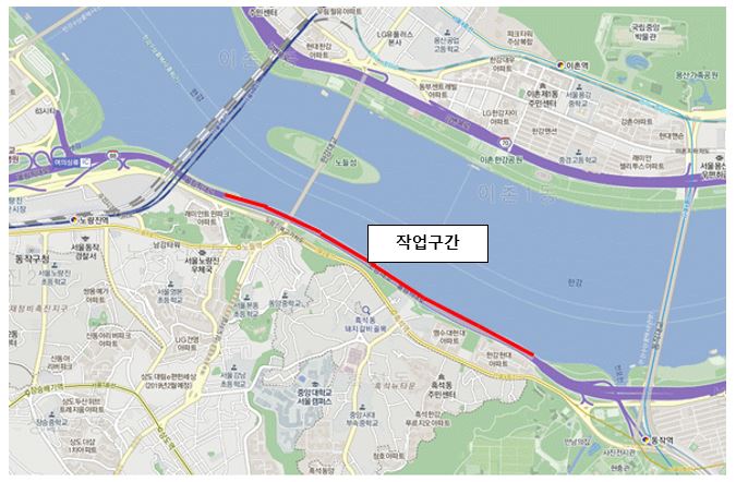 이번 교통통제는 노량교 구간의 방호난간 연석 표면보수와 종 조인트 후타보수를 위한 것이다.