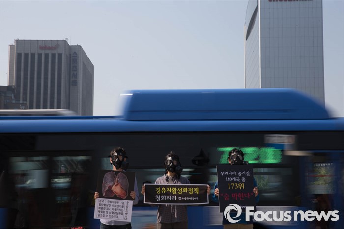 (서울=포커스뉴스) 17일 오전 서울 종로구 광화문광장 인근에서 서울환경연합원들이 경유차 활성화 정책 철회를 촉구하며 퍼포먼스를 벌이고 있다.