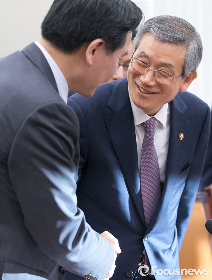 (서울=포커스뉴스) 17일 오전 서울 여의도 국회에서 예정된 법제사법위원회 전체회의에 참석한 김현웅(왼쪽) 법무부 장관과 고영한 법원행정처장이 인사하고 있다.