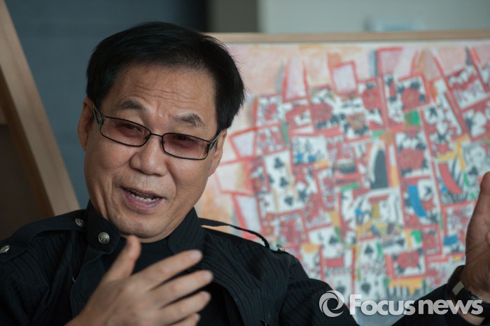 (서울=포커스뉴스) 가수겸 방송인 조영남씨가 청담동 자택에서 자신의화투그림에서 포즈를 취하고 있다. 검찰은 16일 그림 대작을 조사하기 위해 조씨의 그림을 압수수색했다.
