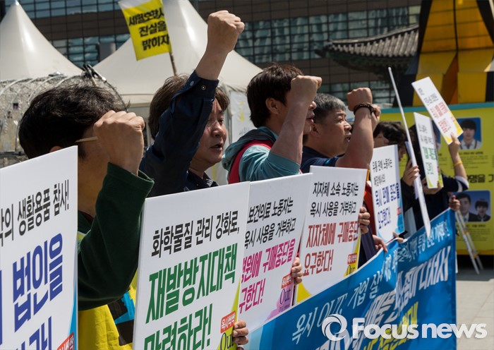 (서울=포커스뉴스) 17일 오전 서울 광화문광장에서 열린 '옥시 불매, 사업장 옥시 OUT' 선언 기자회견에 참석한 민주노총 조합원 및 가습기 살균제 피해자 가족들이 옥시를 규탄하는 구호를 외치고 있다.
