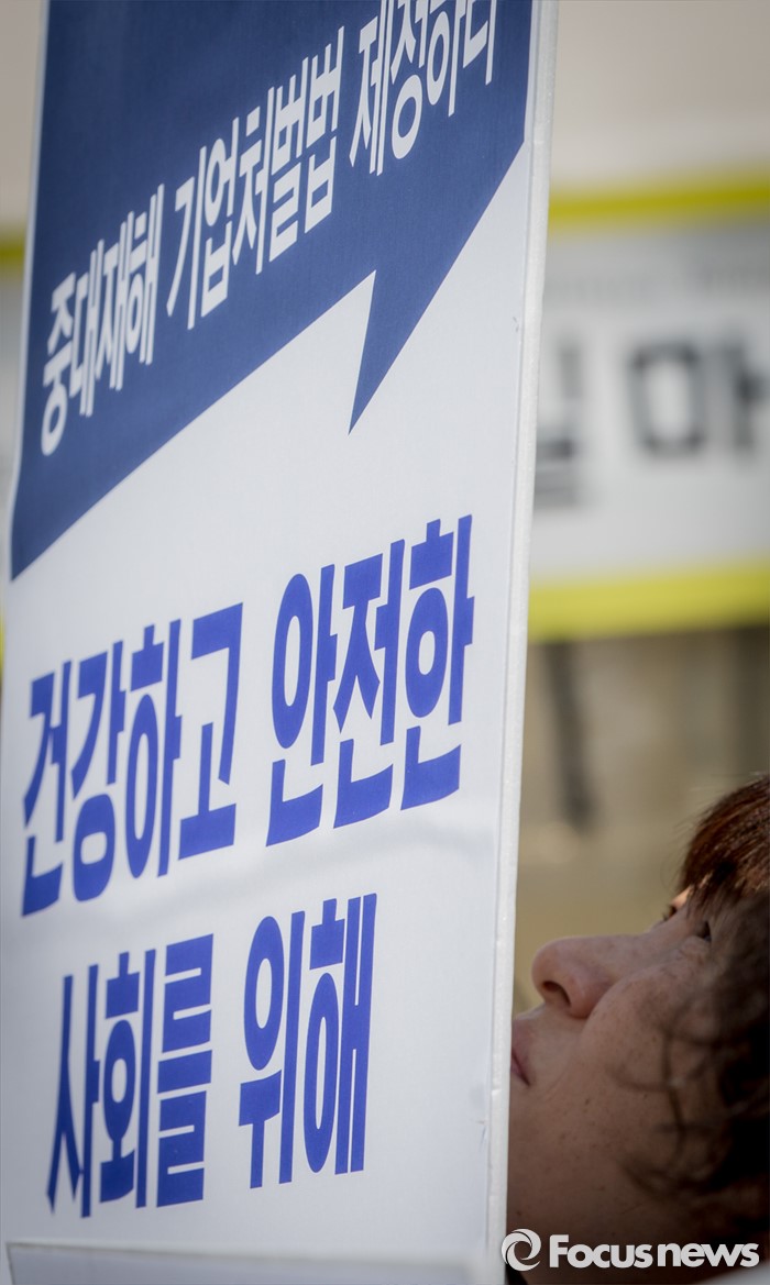 (서울=포커스뉴스) 17일 오전 서울 광화문광장에서 열린 '옥시 불매, 사업장 옥시 OUT' 선언 기자회견에 참석한 민주노총 조합원 및 가습기 살균제 피해자 가족들이 중대재해 기업처벌법 재정을 요구하는 손팻말을 들고 있다.