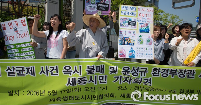 (세종=포커스뉴스) 세종생태도시시민협의회와 세종시민연대회의 구성원들이 17일 오전 세종시 정부세종청사 환경부 앞에서 가습기 살균제 사건 옥시 불매 및 윤성규 환경부 장관 사퇴촉구 기자회견을 하고 있다.
