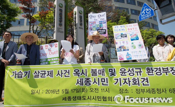 (세종=포커스뉴스) 세종생태도시시민협의회와 세종시민연대회의 구성원들이 17일 오전 세종시 정부세종청사 환경부 앞에서 가습기 살균제 사건 옥시 불매 및 윤성규 환경부 장관 사퇴촉구 기자회견을 하고 있다.