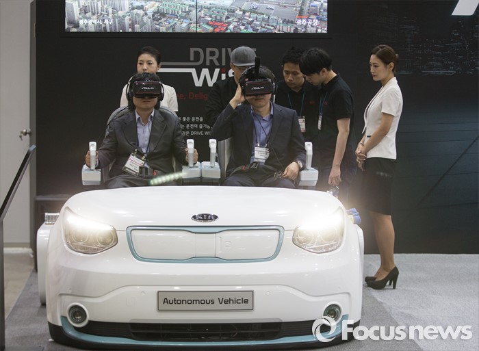 (서울=포커스뉴스) 17일 오전 서울 강남구 코엑스에서 열린 '월드 IT쇼 2016' 의 기아자동차 부스를 찾은 관람객이 VR을 체험하고 있다.