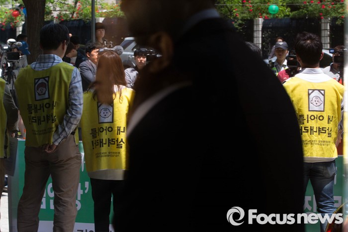 (서울=포커스뉴스) 17일 오후 서울 종로구 내자동 '김앤장' 법률사무소 앞에서 환경 및 시민단체와 가습기 살균제 피해자들이 '김앤장' 법률사무소의 옥시 불법행위 은폐 의혹을 규탄하며 기자회견을 하고 있다.