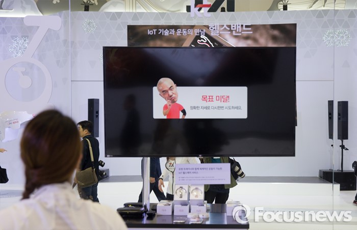 (서울=포커스뉴스) 17일 오전 서울 강남구 코엑스에서 열린 '월드 IT쇼 2016' 의 KT 부스를 탖은 한 관람객이실시간 토레이닝 서비스를 체험하고 있다.