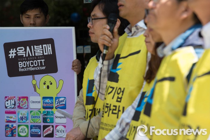 (서울=포커스뉴스) 17일 오후 서울 종로구 내자동 '김앤장' 법률사무소 앞에서 환경 및 시민단체와 가습기 살균제 피해자들이 '김앤장' 법률사무소의 옥시 불법행위 은폐 의혹을 규탄하며 기자회견을 하고 있다.
