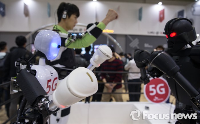 (서울=포커스뉴스) 17일 오전 서울 강남구 코엑스에서 열린 '월드 IT쇼 2016' 의 SK텔레콤 부스의 한 직원이 움직임을 통해 로못을 제어하고 있다. SK텔레콤은 5G의 빠른 통신 속도를 이용해 사람과 기계를 실시간으로 제어하는 기술을 선보였다.