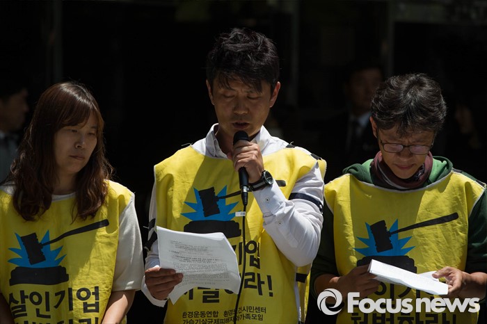 (서울=포커스뉴스) 17일 오후 서울 종로구 내자동 '김앤장' 법률사무소 앞에서 환경 및 시민단체와 가습기 살균제 피해자들이 '김앤장' 법률사무소의 옥시 불법행위 은폐 의혹을 규탄하며 기자회견을 하고 있다.
