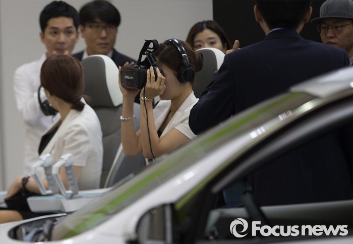 (서울=포커스뉴스) 17일 오전 서울 강남구 코엑스에서 열린 '월드 IT쇼 2016'의 기아자동차 부스의 도우미가 자동차 기반 VR을 체험하고 있다.