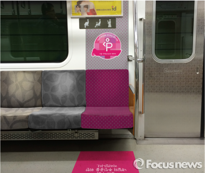 서울메트로는 지난해 7월 임산부 배려석을 쉽게 알아볼 수 있도록 좌석의 시트를 분홍색으로 바꾸고 바닥에는 임산부 배려석을 알리는 안내문을 부착하는 등 디자인을 개선했다.