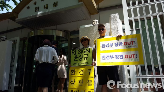 영국에 거주하는 앤드류(54)씨와 김대비(42)씨 부부는 17일 서울 종로구 정부종합청사 앞에서 열린 '환경부 장관 퇴진 릴레이 1인시위'의 두 번째 주자로 참가했다.