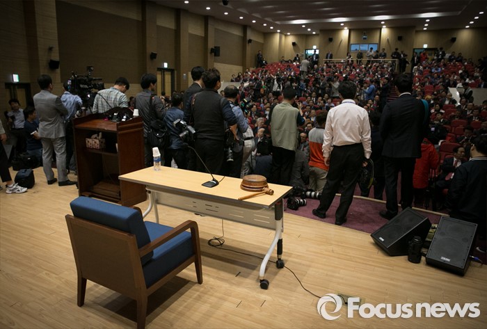 (서울=포커스뉴스) 17일 오후 서울 여의도 국회 의원회관에서 비대위 구성안 및 당헌 당규개정안 등 현안 처리를 위해 예정된 4차 새누리당 전국위원회에 의사봉이 놓여 있다. 이날 전국위원회의는 앞서 예정된 상임전국위원회를 개최해 당헌개정안 등을 심의할 예정이었지만, 친박계 의원들이 대거 불참해 참석자 미달로 회의가 열리지 못 했다.
