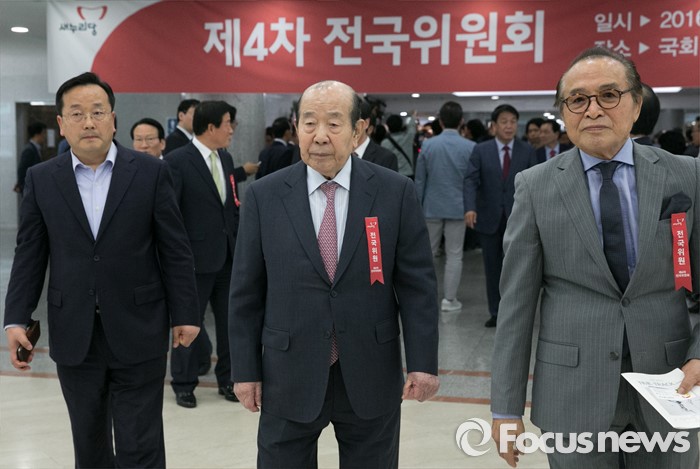 (서울=포커스뉴스) 17일 오후 서울 여의도 국회 의원회관에서 비대위 구성안 및 당헌 당규개정안 등 현안 처리를 위해 예정된 4차 새누리당 전국위원회가 무산된 후 김수한(가운데) 상임고문 등 참석자들이 퇴장하고 있다. 이날 전국위원회의는 앞서 예정된 상임전국위원회를 개최해 당헌개정안 등을 심의할 예정이었지만, 친박계 의원들이 대거 불참해 참석자 미달로 회의가 열리지 못 했다.