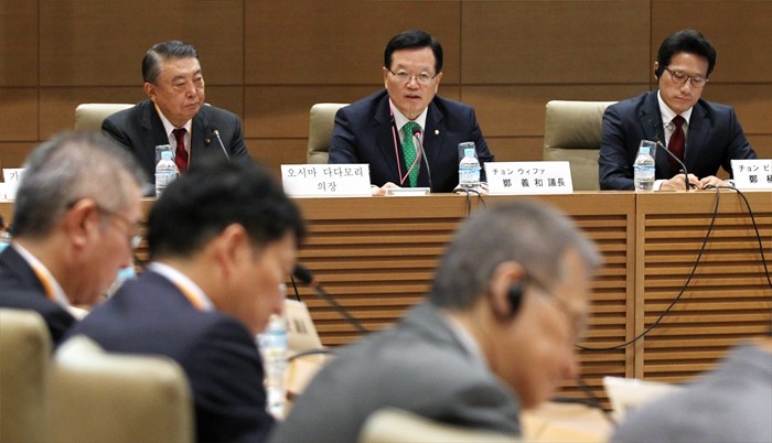 (서울=포커스뉴스) 정의화(가운데) 국회의장이 17일 오전 일본 도쿄 중의원 제1의원회관에서 열린 '1회 한·일의회 미래대화'에 참석해 미래지향적 한일관계 발전을 주제로 기조연설을 하고 있다. <사진제공=국회>