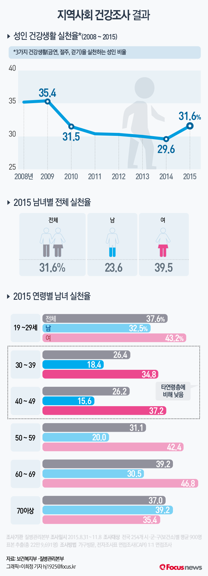 (서울=포커스뉴스) 17일 질병관리본부가 만19세 이상 성인을 대상으로 조사한 ‘2015년 지역사회건강조사’에 따르면 2015년 금연, 절주, 걷기의 3가지 건강생활을 모두 실천하고 있는 성인은 31.6%로 나타났다. 연령대별로 살펴보면 30대(26.4%), 40대(26.2%)의 건강생활실천율이 다른 연령층보다 낮았다.