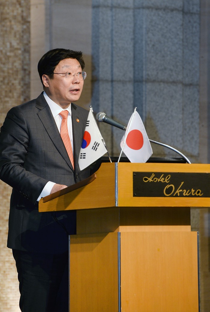 (서울=포커스뉴스) 주형환 산업통상자원부 장관이 17일 일본 동경 오쿠라호텔 별관에서 열린 제48회 한일경제인 회의에 참석해 기조연설을 하고 있다. 주 장관은 기조연설에서 한일 양국 경제인들이 협력하여 양국의 공동성장과 동아시아의 번영에 기여할 협력방안을 제시했다.
