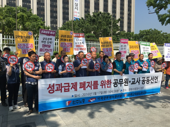 이들 단체는 향후 성과급제 폐지를 위한 공동 투쟁에 나설 방침이다.전국교직원노동조합과 전국공무원노동조합 등은 17일 오전 서울 종로구 정부종합청사 앞에서 기자회견을 열고 성과급제 폐지를 주장하고 있다. <사진제공=전국교직원노동조합>
