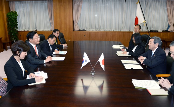 (서울=포커스뉴스) 주형환 산업통상자원부 장관이 17일 오후 일본 동경 경제산업성 집무실에서 하야시 모토오(林幹雄) 경제산업성 대신과 면담을 갖고, 한일 양국간 통상협력과 통상장관채널 정례화 등 양국의 통상현안을 주제로 의견을 교환하고 있다. <사진제공=산업통상자원부>